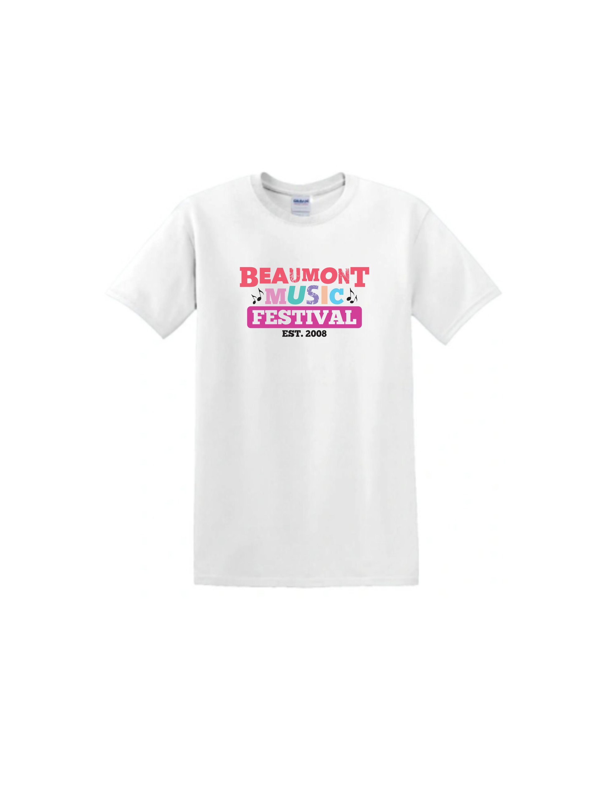 White cotton tee shirt with the Beaumont Music Festival full colour logo on the front.